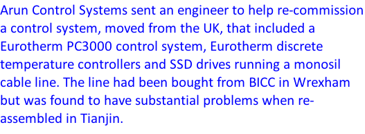 integrated control and monitoring systems go to instrumentation go to instrumentation go to instrumentation go to instrumentation go to instrumentation go to instrumentation SSD motor AC Drives Re-programming the system using the Eurotherm PC3000 programming tool, PS Re-programming the system Heater control panel - Eurotherm Thyristors Arun Control Systems was asked to provide engineering assistance by Pirelli Tianjin Cables Company at their manufacturing site in the North Eastern city of Tianjin. Tianjin is about 90 minutes from Beijing. Case Study - Tianjin, China s